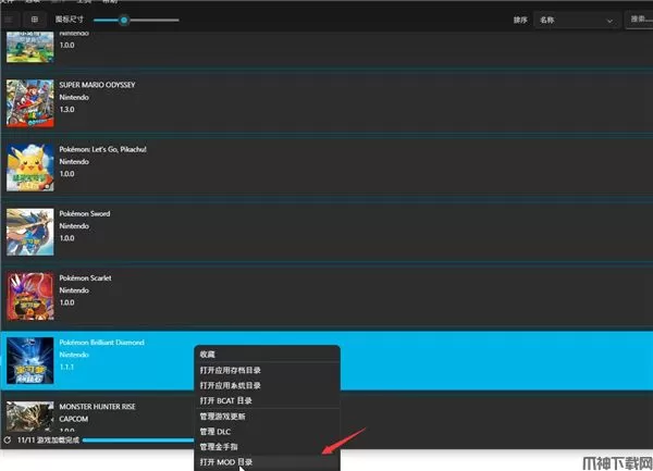 2、然后我们随便找到一个游戏,这里以宝可梦钻石为例子,右键点击宝可梦钻石选择打开MOD目录;