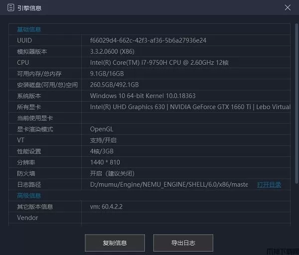 启动运行出现异常的游戏,点击引擎右上角“设置"、”引擎信息“打开如下图的界面,点击底部”复制信息“即可。