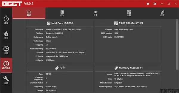 2、在其主窗口中,OCCT 显示有关硬件设备的详细信息,例如CPU和主板。此外,还有一个表格,您可以在其中查看当前和超频的CPU和总线频率。