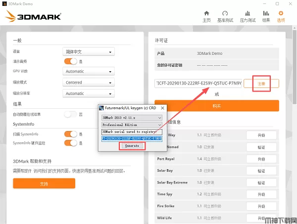 PS:Futuremark 3DMark专业版,内置激活文件可解锁完整功能,专业版提供命令行自动化、图像质量分析工具等高级功能!