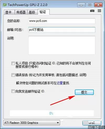 4、在TechPowerUp GPU-Z的验证中我们可以输入名字、邮箱和评论等,然后点击提交就可以等待gpu-z的验证邮件;
