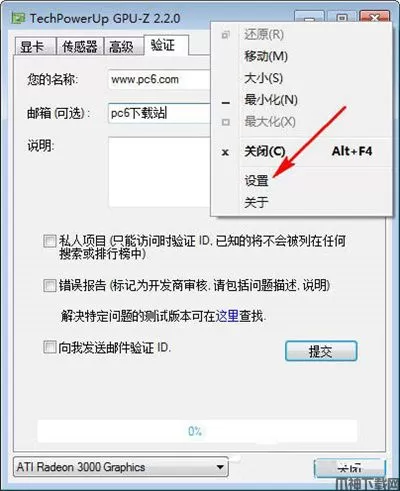 5、使用gpu-z显卡检测软件可以很快速的进行显卡体质测试,我们在软件上方的标题栏右键单击然后可以选择设置;