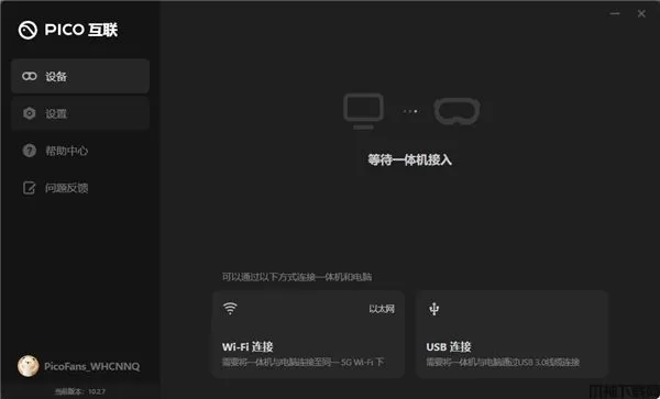 使用起来非常简单,用户只需要在电脑中下载一个SteamVR、PICO互联,并登录你的账号,支持以太网和USB两种连接方式,连接之后我们即可在设置中游戏清晰度、码率、音频、桌面显示。