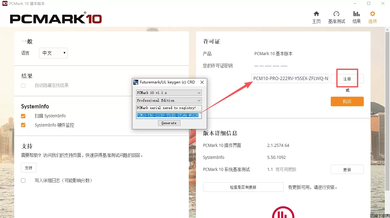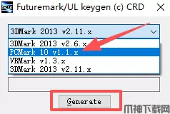 7、选择选择PCMark 10 v1.1.x和Professional Edition,点击Generate生成许可证密钥。