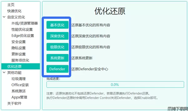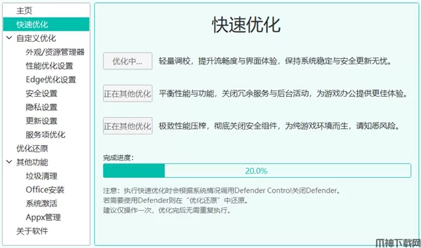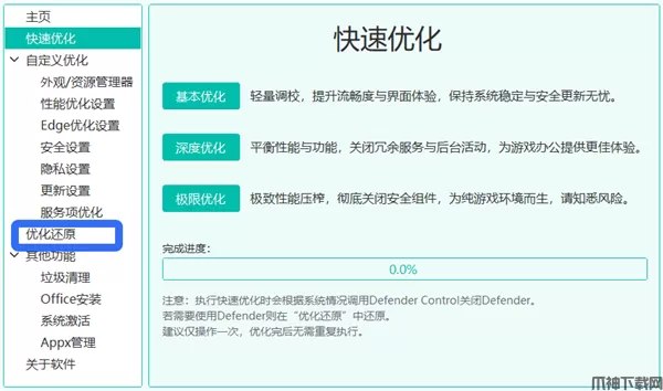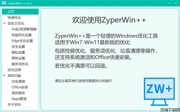 ZyperWin++绿色版是基于.NET4和SunnyUI开发的一款轻便Windows优化工具,此版本无需安装即可使用。软件主要适用于Win7-Win11的优化操作,带来基本优化、深度优化、极限优化三大优化方式,帮助用户解决电脑卡顿问题、提升电脑性能以及运行流畅度。