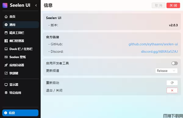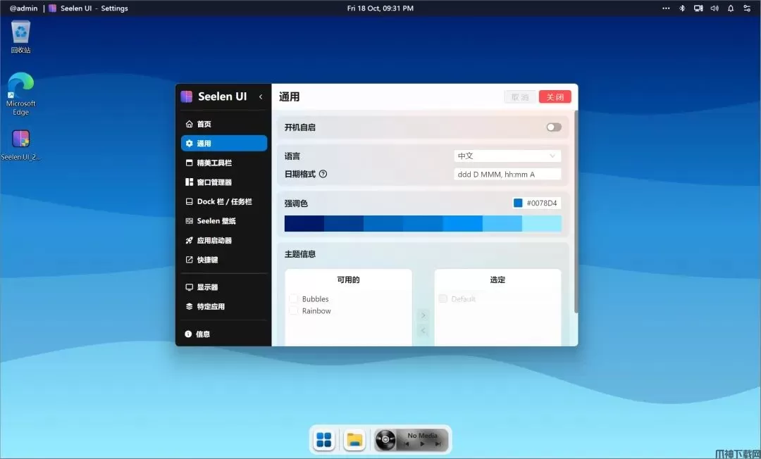 在“通用”选项卡里,用户可以进行基础设置。比如更换桌面壁纸、选择语言、修改 Windows 主题色,甚至设置 Seelen UI 开机自启。