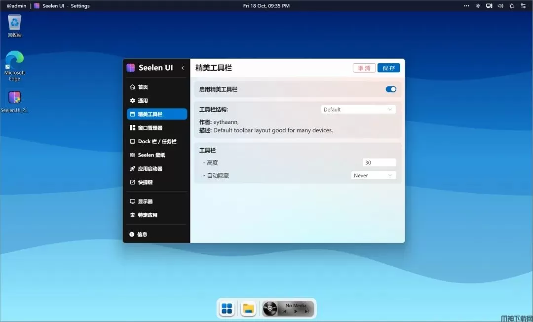 启用“Fancy Toolbar”后,用户可以将 Seelen 工具栏放在桌面顶部,替代 Windows 默认的任务栏。