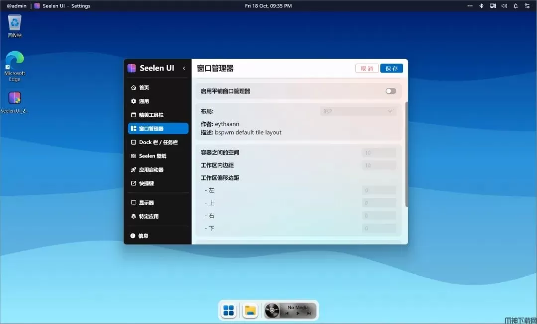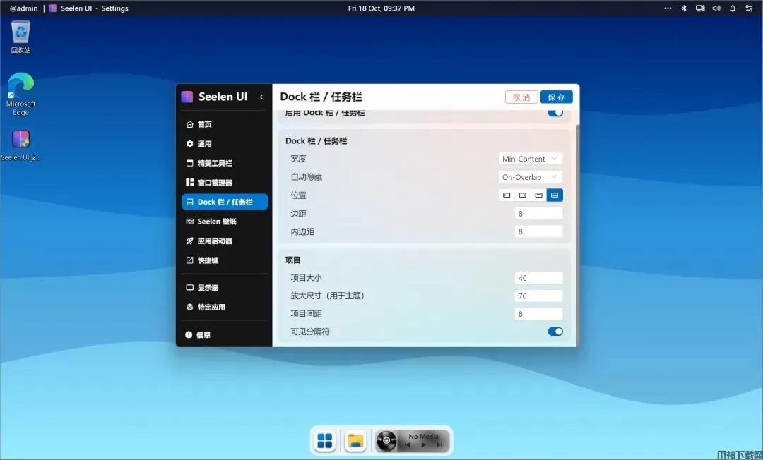 “Dock栏/任务栏”选项允许用户自定义 Seelen UI 提供的悬浮 Dock 栏,用户可以调整它的大小、可见性、位置和宽度。