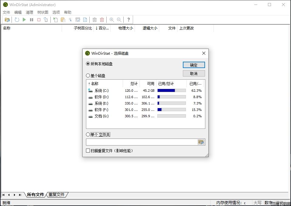 3、目录树模式中也带有多种统计方式,分析过后,你可以看到每个文件夹的体积、文件夹下带有多少文件、以及每个文件夹占用空间的百分比。