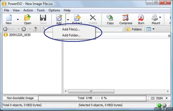 2、按下工具栏上的“增加”按钮,将文件和文件夹添加到ISO文件中来。您还可以直接将文件或文件夹从资源管理器中拖动到PowerISO主窗口中。