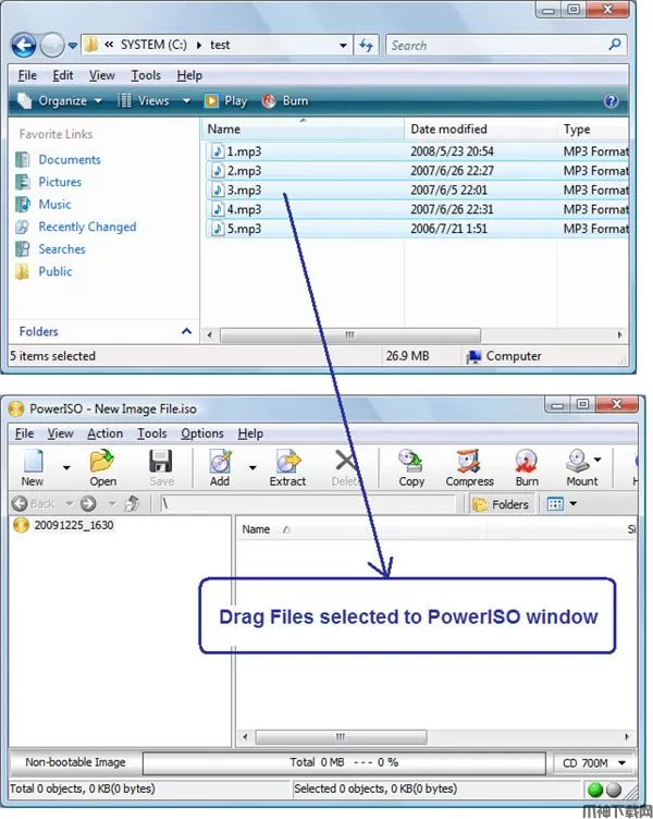 3、将这些文件拖动到PowerISO主窗口中,这些文件将被添加到ISO文件。
