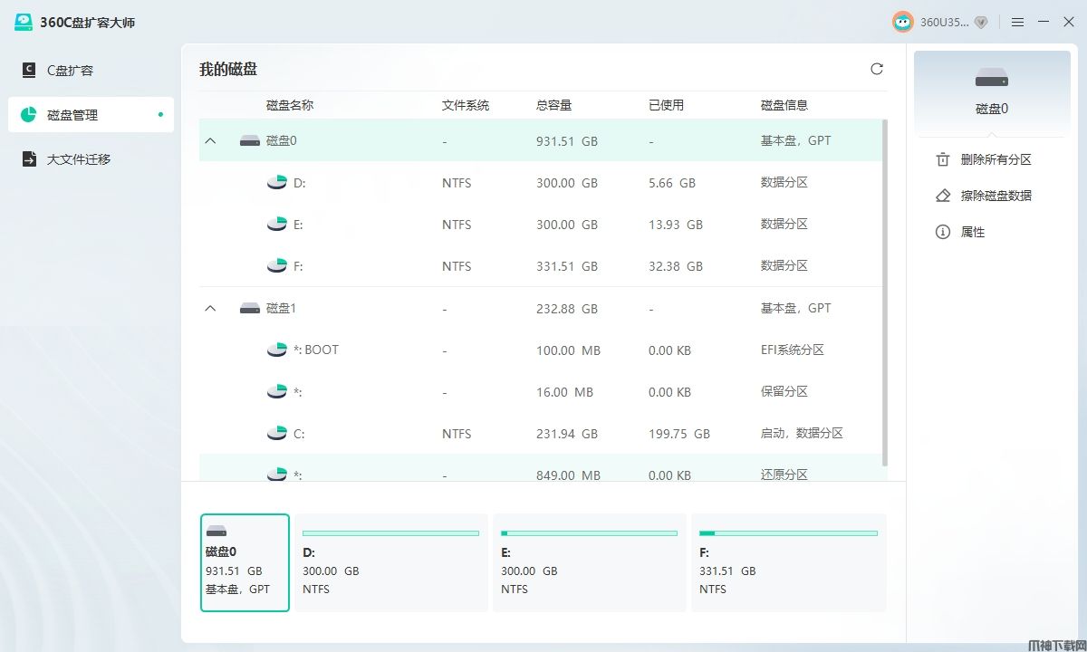 打开360C盘扩容大师,进入磁盘管理页面,选择一个要调整大小的磁盘,右侧是我们可以对他执行的操作