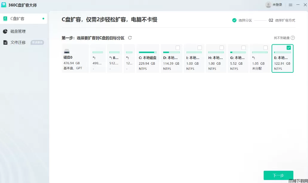 1、进入360C盘扩容大师的C盘扩容页面,选择一个剩余空间较多,可以扩容到C盘上的分区,这里可以选择一个不与C盘相邻的盘哦~ 如下图拿E盘举例