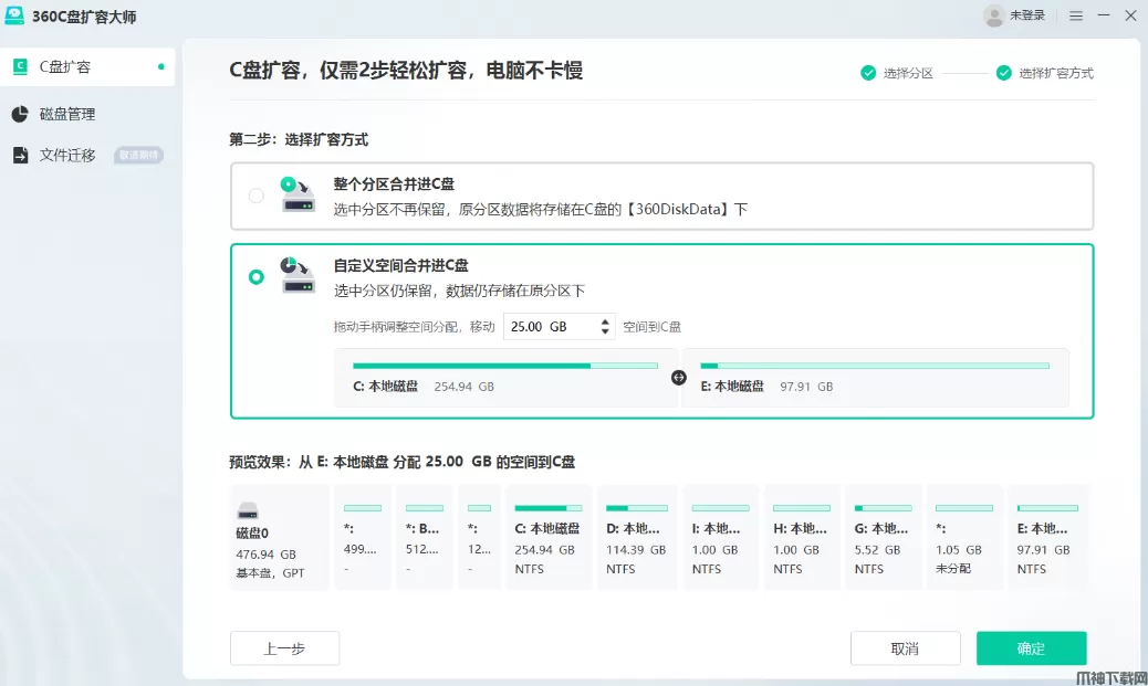 此方式您可以设置要合并多少空间到C盘上,例如,E盘有100GB空间,已经使用1GB,您可以选择自定义要合并的空间,例如30GB,50GB,75GB等等,此方式合并后E盘仍保留,故而基本不会影响他上面的应用程序。