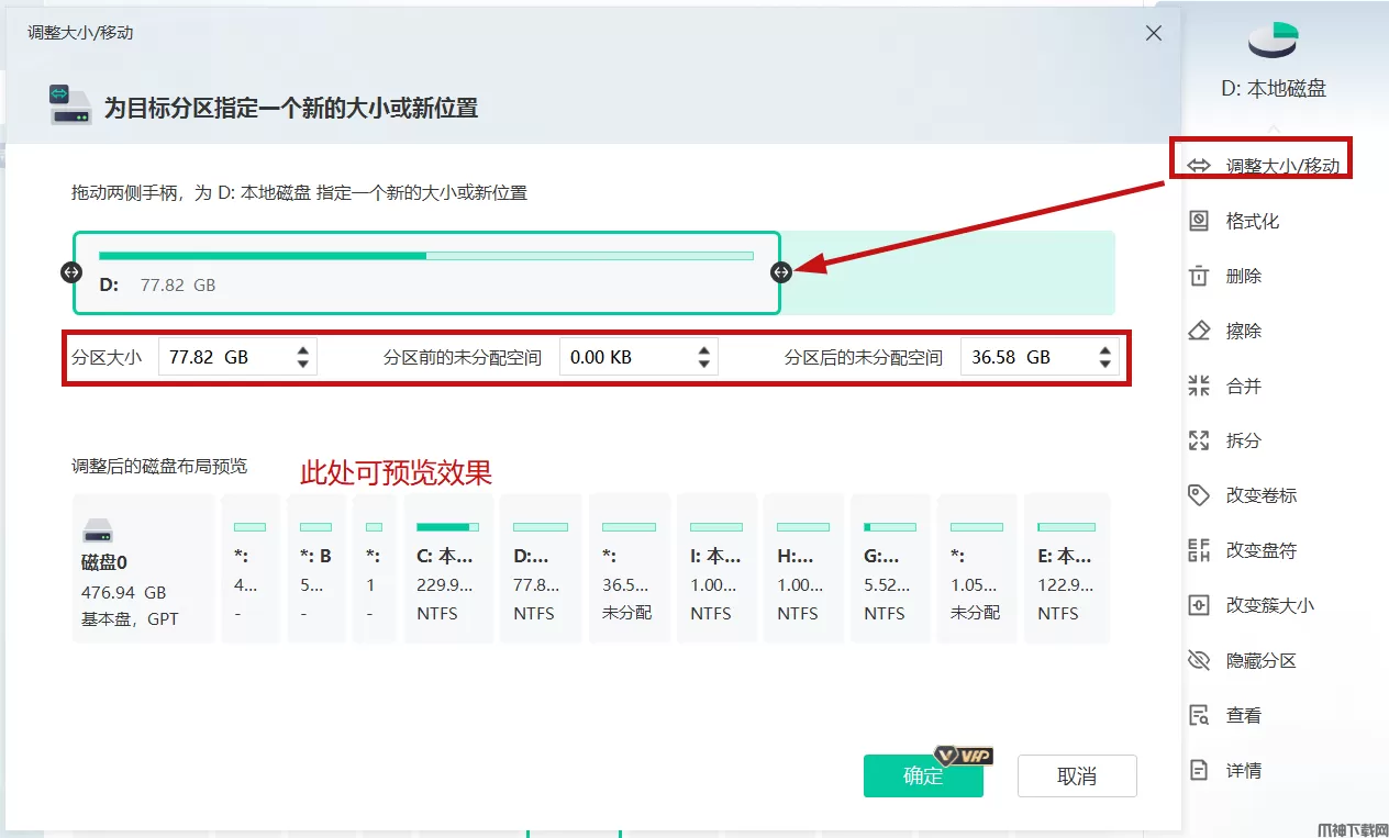 选择一个盘,例如D盘,点击调整大小/移动操作,可拖动分区条调整D盘的空间大小,或者手动设置D盘空间的大小。