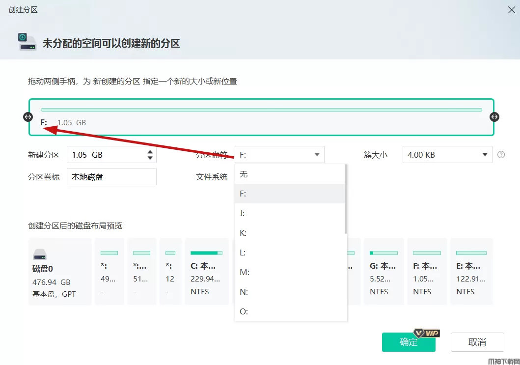 创建分区:选中未分配的盘,点击右侧的创建分区,給这个分区分配一个盘符,然后按步骤操作就可以啦