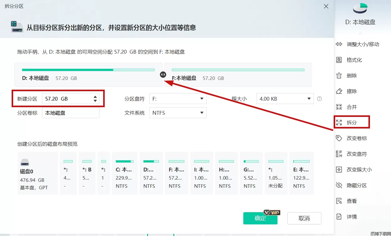 如下图,选择D盘,点击右侧拆分操作,同样的可以拖动分区条或者手动设置拆分出去的盘的空间大小,可以为其选择一个盘符,例如F盘,这样拆分后就可以得到一个新的磁盘分区了。选择后我们点击确定按照步骤执行就可以啦