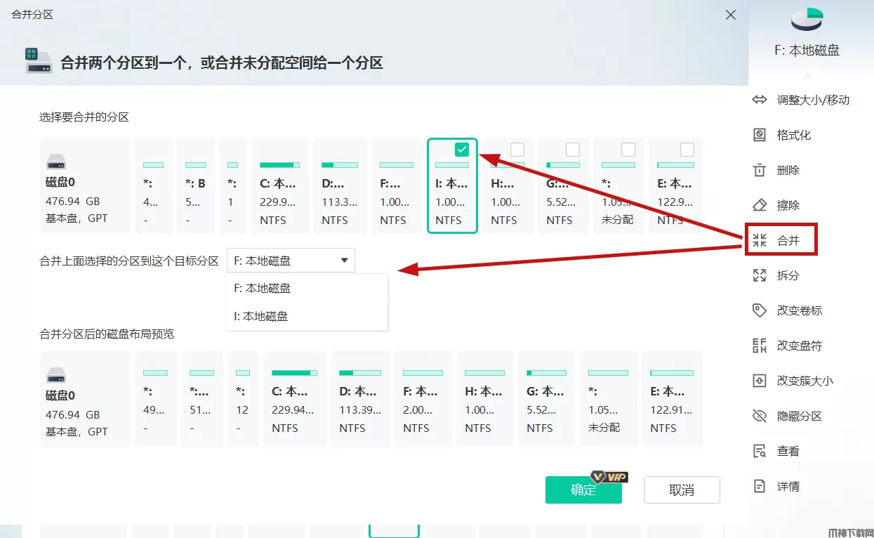 拆分后,我们选择这个F盘,点击右侧合并操作,选择一个要合并的盘,这里我们选择I盘,同时我们可以选择合并的形式,是将F合并到I,或者将I合并到F,建议是将没有数据或数据较少的盘合并到另一个盘上,以免造成合并过程中数据丢失的问题