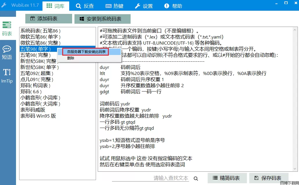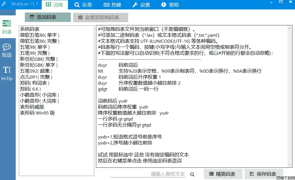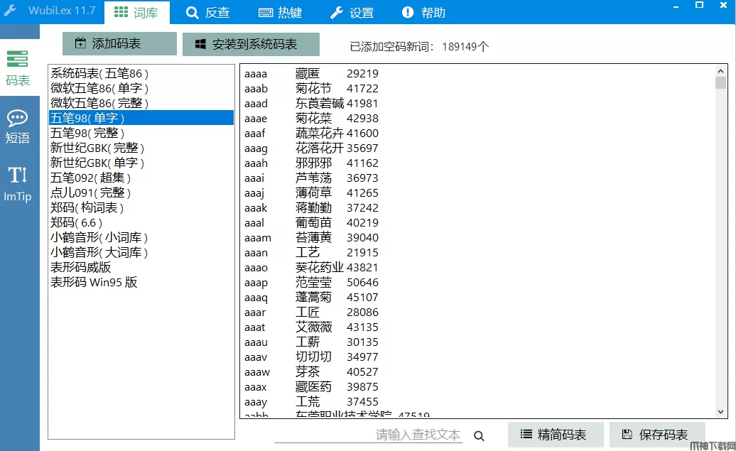 WubiLex可以替换微软五笔的系统码表和短语词库。自带多种码表,包含86、98、新世纪、小鹤音形、郑码以及表形码等等码表。