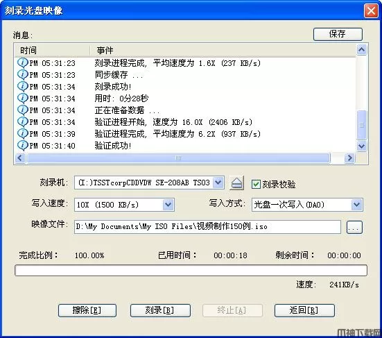 第五步,刻录。点击”刻录“按钮开始刻录光盘映像,‘刻录+刻录校验’可能需要花费几分钟到十几分钟左右的时间,请耐心等待刻录完成。刻录完毕之后,光驱会自动弹出。刻录成功。