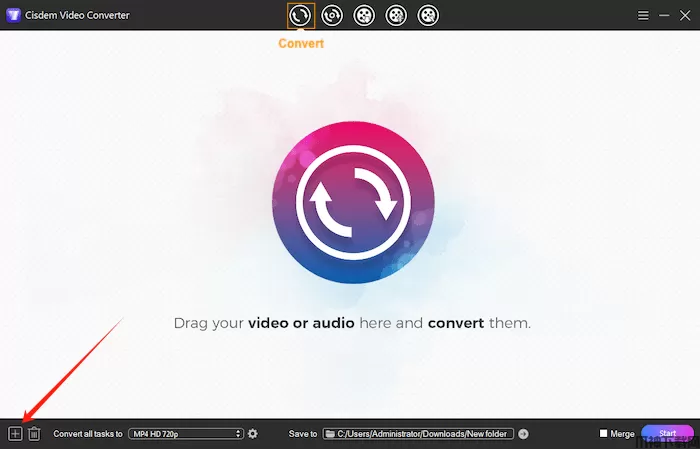 1、选择“转化率”选项卡,然后您可以通过拖放或单击“+”主界面左下角来导入视频。