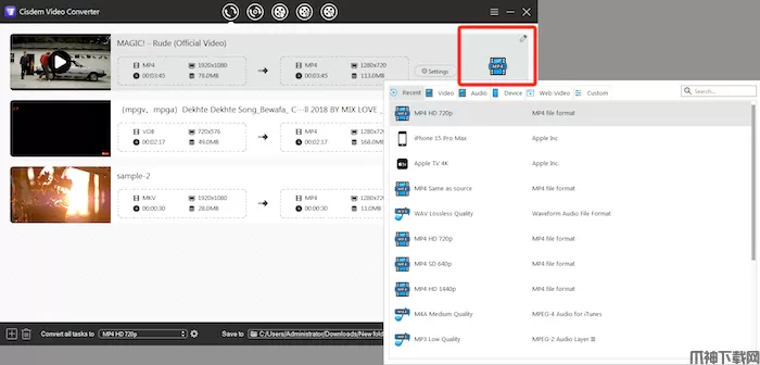 1、Cisdem Video Converter 支持多种输出视频格式,只需单击下列图标,即可选择所需的格式。如果要将多个视频转换为相同的格式,可以直接单击“将所有任务转换为”并选择所需的格式。