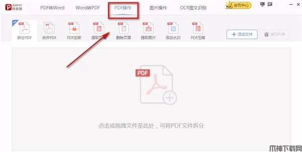 1、首先打开软件,我们在界面上方找到“PDF操作”选项,点击该选项就可以进入到PDF操作页面。