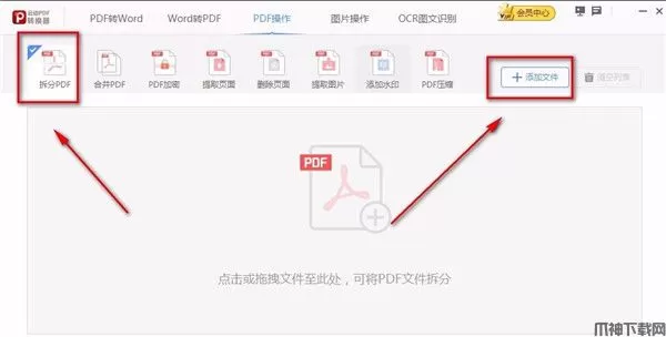 2、进入到PDF操作页面后,我们点击界面左上方的“拆分PDF”选项,并点击界面右上方的“添加文件”按钮。