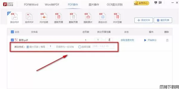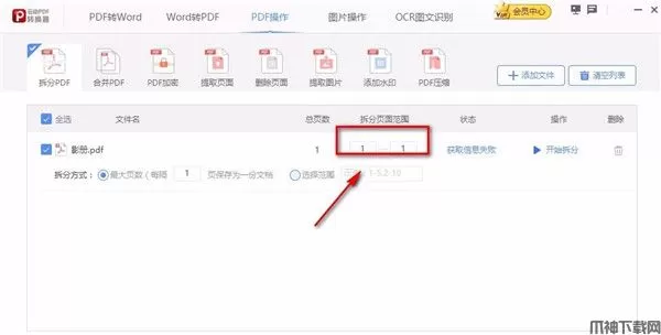 4、然后在界面上方找到“拆分页面范围”选项,我们在该选项下方的文本框中输入页面拆分范围即可。