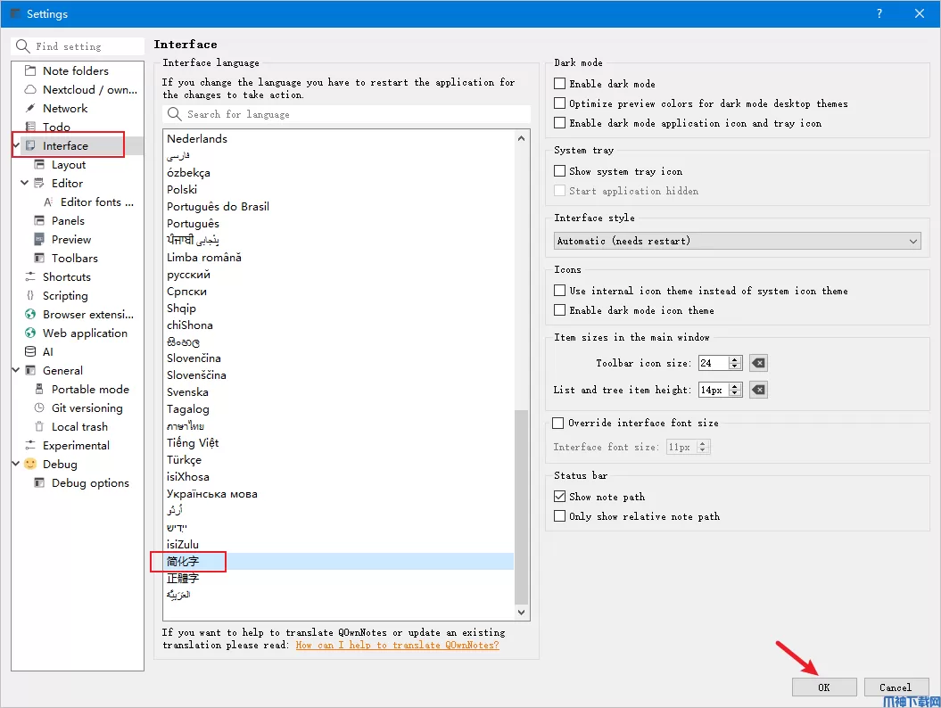 2、点击第五项:interface,找到“简化字”,设置重启即可。