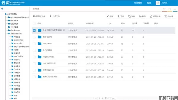 云深文档管理系统是一款从非结构化数据信息的整体、全局和发展的角度出发的文档管理系统,随着行业办公用户的发展,我们每天都需要管理并处理着众多的文档,想要科学化、安全的管理这些文档我们就需要一套专业的文档管理系统,云深文档管理系统就是这么一款软件,它以“人与文件,文件与文件的关系”为中心,并支持创建相应的分类知识库和文档管理目录,可满足于行业用户的文档管理和日常系统办公的需求。为保障文档管理成功应用而提供的基础支撑工具。该系统从文档自动采集与分类配置、统计管理、存储保管、检索利用和安全保障的规划、设计、部署、运行、维护,本站提供的云深文档管理系统安全,无病毒,无恶意代码,请放心使用,有需要的朋友请到本页面下方下载,千万不要错过哦!