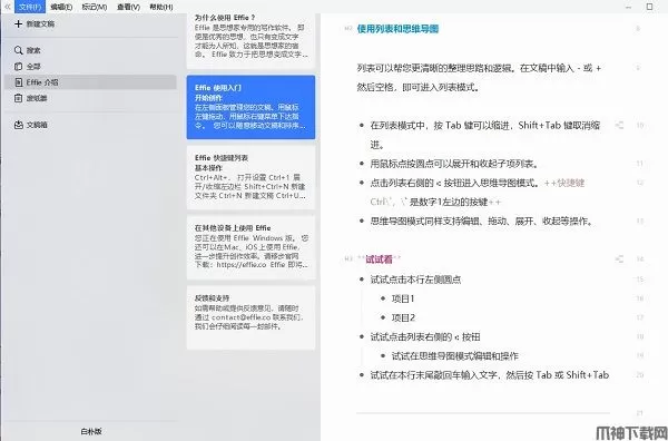 effie电脑版是一款由B站大佬自制的功能强大、简单专业的写作软件,它可以百分之八十的解决用户在写作上的烦恼。怎么说呢?首先,在于它的强大性,内置文本搜索、团队管理、文件稿、随笔、笔记阅读、思维导图等多种功能,可以全方位的满足用户的写作需求。而且软件的大纲和正式的稿件内容可以存在于一个文档之中,非常简洁便利,对比一些只有部分功能的软件,在完整写作这个角度,可以说很完美了。