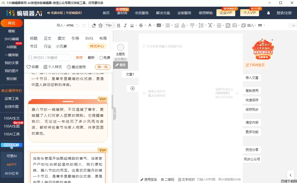 135编辑器电脑版是一款专为微信公众号等平台设计的在线图文排版工具,它集成了海量模板素材与高效的AI辅助功能,支持用户通过简单的拖拽操作快速完成文章框架搭建,并提供一键排版、全文配色、样式刷、批量替换等智能化工具,大幅提升排版效率。