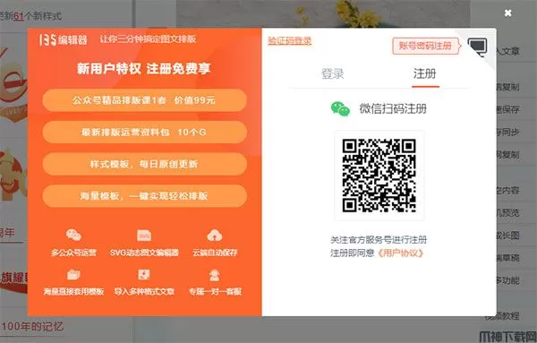 微信扫码关注135平台服务号,即可快速完成注册,当然,也可以用手机号、QQ、微信第三方账号来注册。