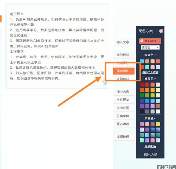 在135编辑器首页右侧,点击【保存同步】,即可保存已经编辑排版好的文章。