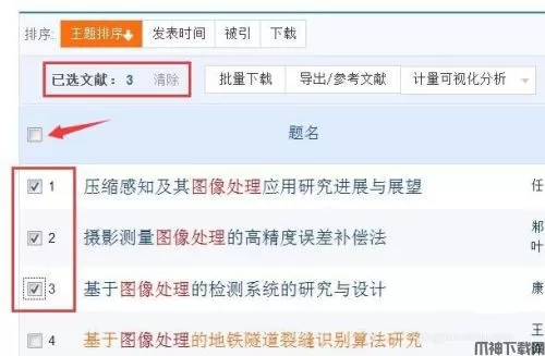 2、清除之前已选文献后,单击文献之前“复选框”选择文献,如图已选中3个文献,还可以单击箭头所指“复选框”选中该页全部文献。