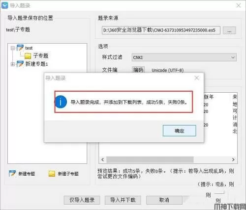 5、安装完软件后,打开下载的题录文件,会弹出“导入题录”窗口,新建一个文件夹储存或者使用已有文献夹,可以看到内容是之前选中的5篇文献,接着单击“仅导入题录”。