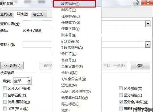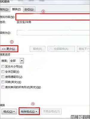 3、鼠标点一下【替换内容】的框,点击【更多】,出现折叠的面板,点击【特殊格式】;