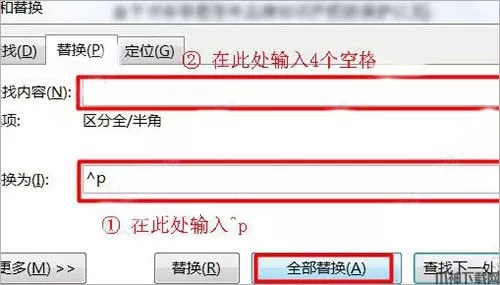 8、打开【替换】对话框,在【查找内容】框里,输入4个空格(前一步你判断有几个空格就输入几个空格),在【替换为】框里输入”^p“,点击【全部替换】;