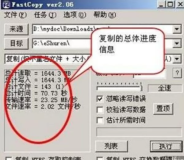 在执行过程中会显示读取、写入、时间、传输效率、文件速率等信息,在下方的文本框中会显示当前拷贝的内容(如图9所示)。拷贝完成后点击“显示列表”按钮可以查看拷贝内容及错误文件、目录信息。