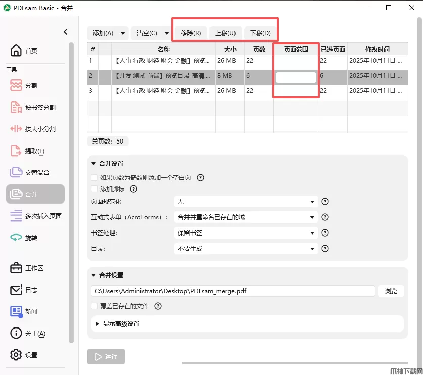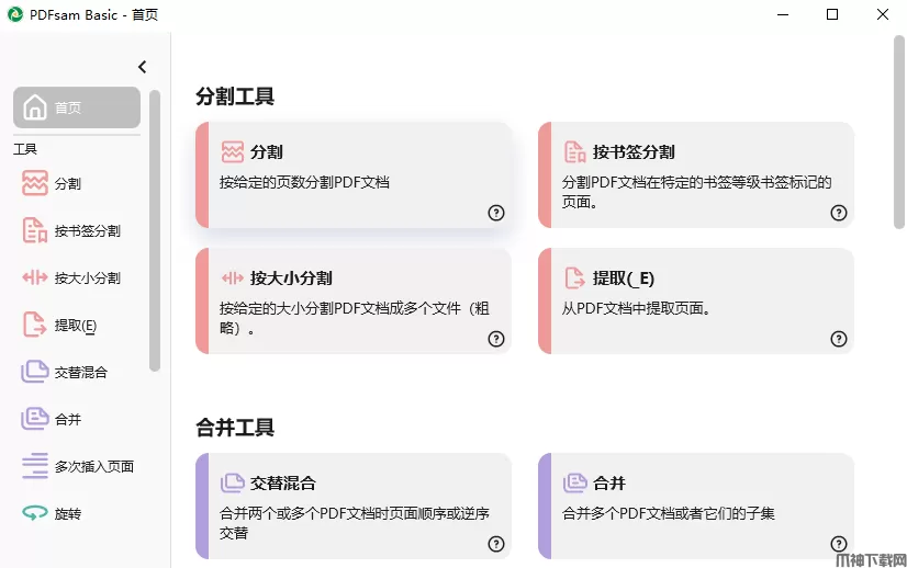 PDFsam Basic是一款功能全面且易于使用的免费PDF处理工具,它能够帮助用户轻松完成对PDF文件的拆分、合并、页面提取、混合及旋转等常用操作。