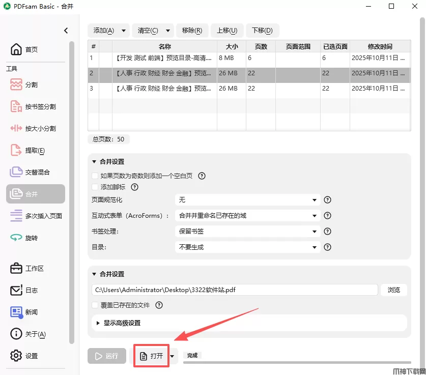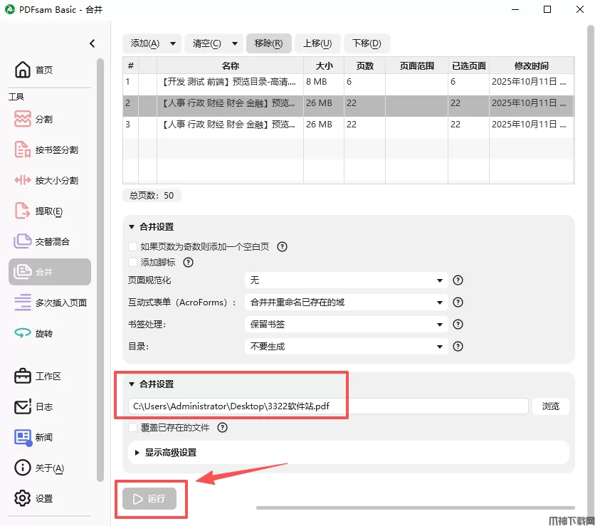 3、选择生成的 PDF 文件名并点击【运行】合并文件。
