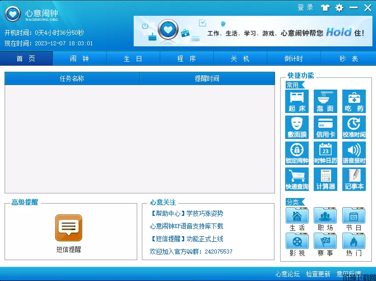 心意闹钟电脑版是一款免费的电脑闹钟软件,长时间在电脑面前工作,会让我们非常的疲惫,导致有很多待办的工作给忘了,心意闹钟就是为此而生的,心意闹钟有闹钟提醒、短信提醒、生日管理、定时执行程序、定时关机、快捷倒计时、计时器(秒表)、整点报时等特别实用的功能,如果你有事不在电脑傍边,还可以用手机接收提醒信息,这点我个人感觉是最好的,正因为有如此强大和全面的功能,所以现在有很多人在用心意闹钟,反响还特好,如果你需要这么一款功能亮点这么多的闹钟的话,就来下载使用心意闹钟吧