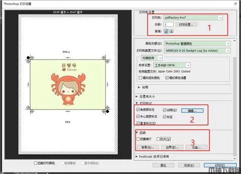 二是“打印标记”,在这里可以设置一些角裁剪标,添加说明等内容,便于打印后的裁剪工作
