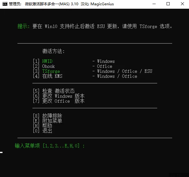 2、以管理员身份运行MAS激活工具,选择需要使用的功能,对应序号即可