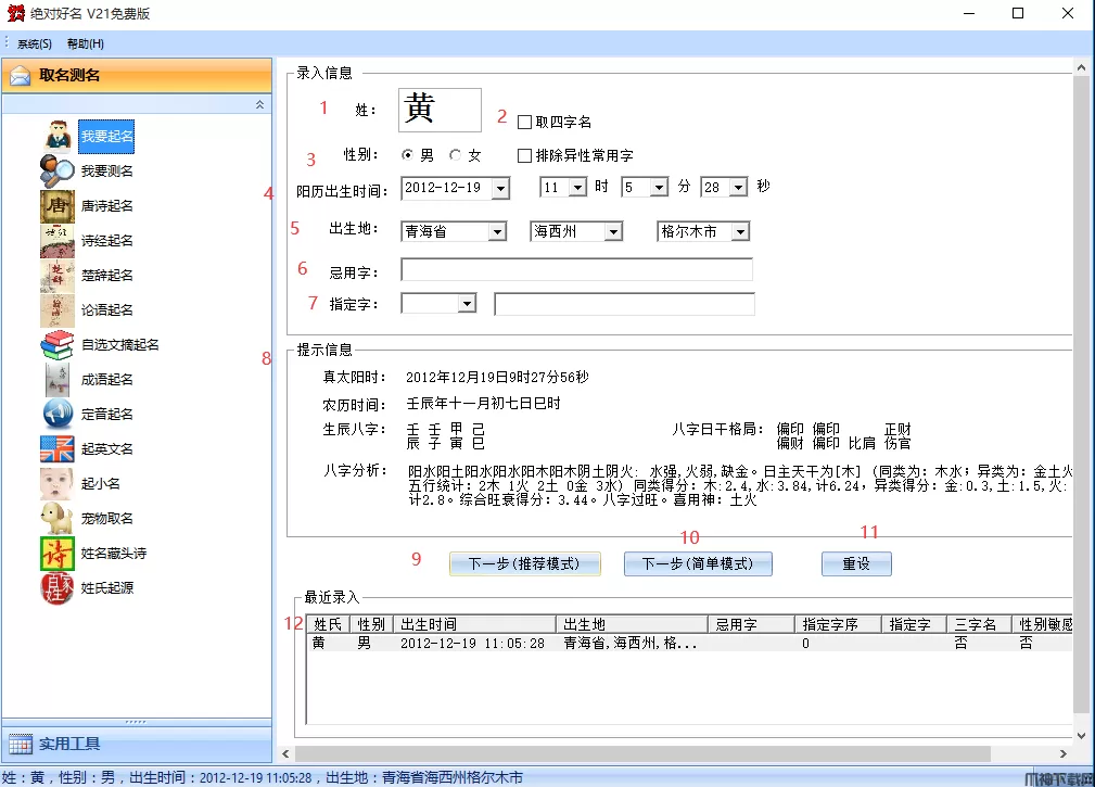 输入姓氏、性别、出生时间、出生地、忌用字、指定字等信息,按下一步即可。下面分别介绍各项的含义及注意事项。