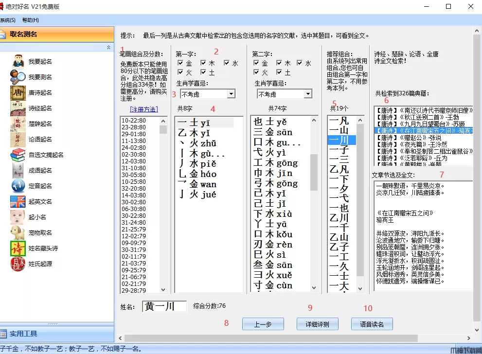 6、独有的“诗经起名”、“楚辞起名”、“唐诗起名”、“论语起名”功能,全唐诗检索、姓名藏头诗、宝宝天数计算、称骨算命等。
