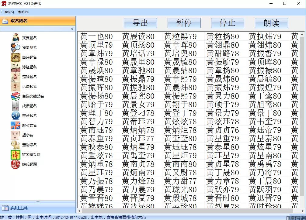在生成名字时,软件在后台一直在进行着名字的运算和评测打分,点暂停可以暂停掉正在进行的计算组合,同时该按钮变为【恢复】,点恢复可以继续生成名字。