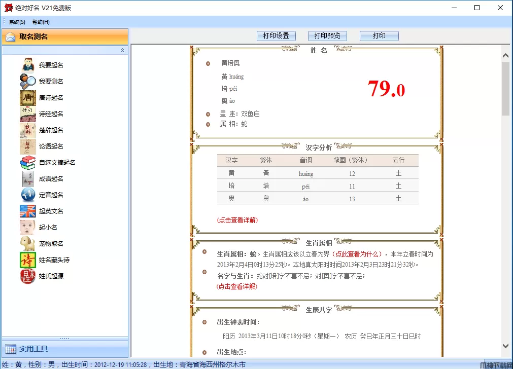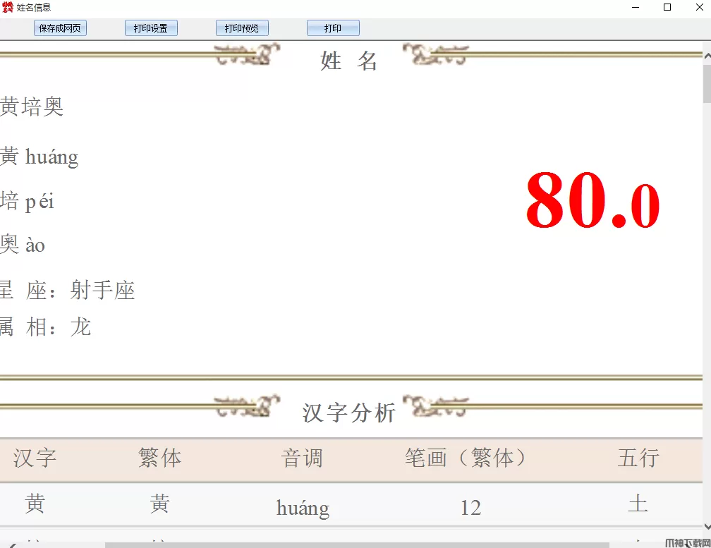 输入姓氏、名字、出生时间(阳历)、出生地、性别后,点【分析】,出现下图的姓名的详细评测页:
