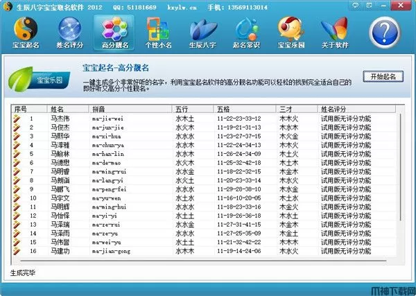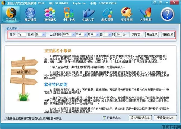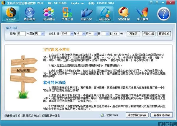 1、 使用简单,只要你有电脑,安装上本软件你的电脑就会变成一个高分起名专家。通过鼠标简单操作就可以为你的宝宝取一个专业的高分好名。